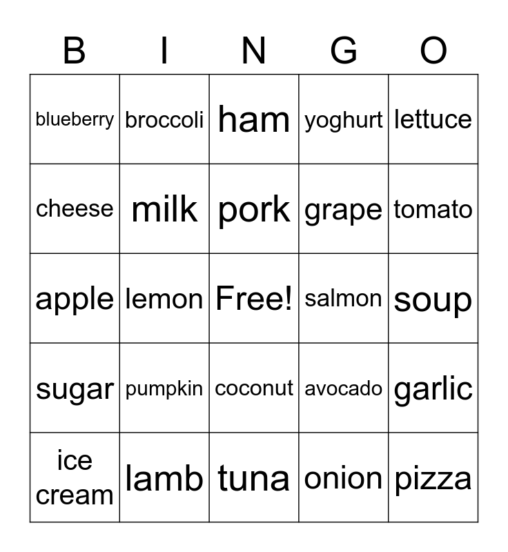 This bingo card has a free space and 24 words: pumpkin, lamb, pork, ice cream, lettuce, blueberry, cheese, broccoli, salmon, coconut, grape, apple, avocado, garlic, milk, onion, soup, ham, tomato, lemon, pizza, sugar, yoghurt and tuna.