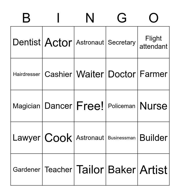 This bingo card has a free space and 24 words: Cook, Teacher, Waiter, Gardener, Flight attendant, Dentist, Hairdresser, Actor, Policeman, Astronaut, Doctor, Magician, Businessman, Builder, Cashier, Baker, Nurse, Astronaut, Farmer, Dancer, Artist, Lawyer, Secretary and Tailor.