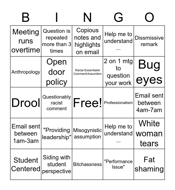 This bingo card has a free space and 24 words: "Providing leadership", Siding with student perspective, Racial Essentialist Comment/Assumtion, Student Centered, Dissmissive remark, Meeting runs overtime, Anthropology, Question is repeated more than 3 times, Professionalism, Misogynistic assumption, 2 on 1 mtg to question your work, Drool, Help me to understand ..., White woman tears, Open door policy, "Performance Issue", Email sent between 4am-7am, Copious notes and highlights on email, Bug eyes, Questionably racist comment, Fat shaming, Email sent between 1am-3am, Help me to understand ... and Bitchassness.