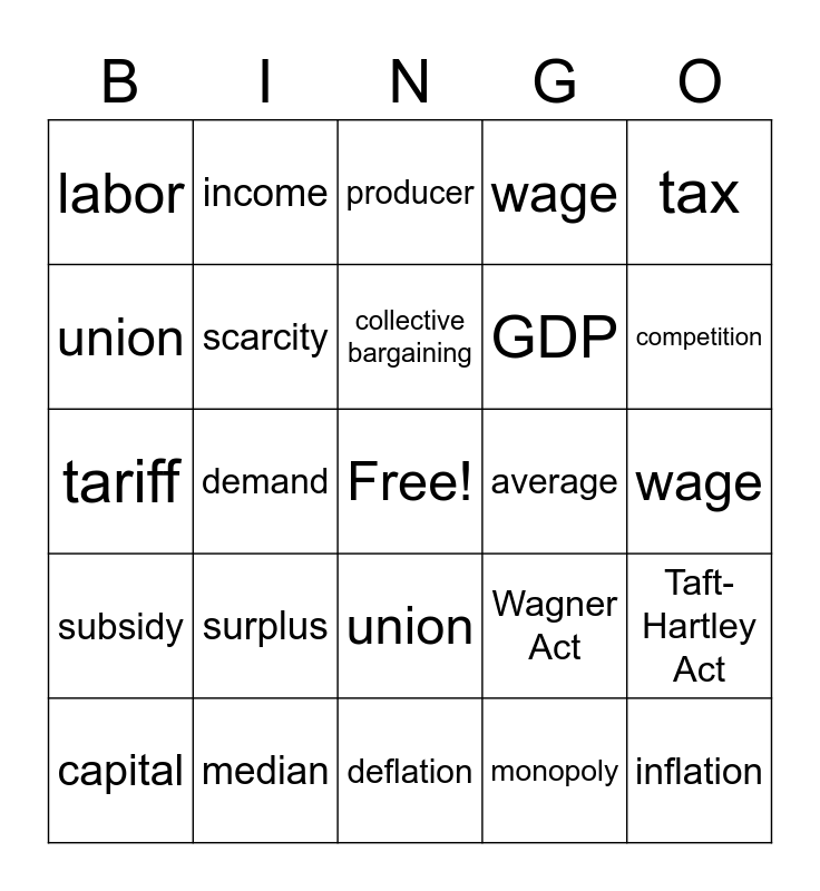 This bingo card has a free space and 29 words: capital, consumer, demand, supply, labor, producer, scarcity, surplus, average, median, wage, inflation, deflation, monopoly, competition, strike, union, subsidy, tax, tariff, Wagner Act, entrepeneur, GDP, union, wage, income, Taft-Hartley Act, collective bargaining and fiscal policy.