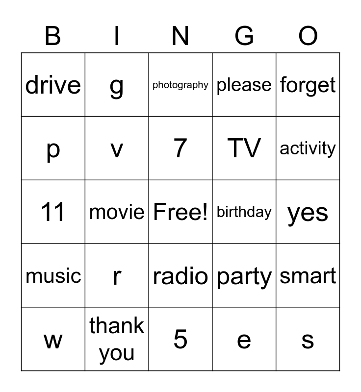 This bingo card has a free space and 70 words: no, yes, okay, fine, thank you, think, please, understand, forget, dream, smart, art, drive, photography, video, movie, radio, TV, dance, music, birthday, party, activity, play, a, b, c, d, e, f, g, h, i, j, k, l, m, n, o, p, q, r, s, t, u, v, w, x, y, z, 1, 2, 3, 4, 5, 6, 7, 8, 9, 10, 11, 12, 13, 14, 15, 16, 17, 18, 19 and 20.