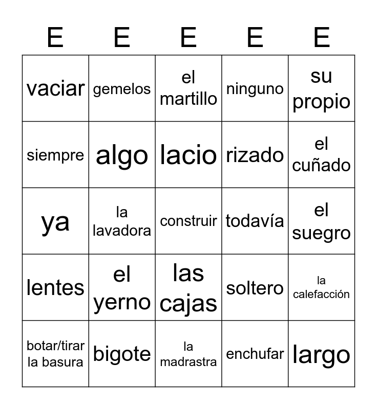 This bingo card has a free space and 24 words: el yerno, bigote, lacio, botar/tirar la basura, su propio, vaciar, siempre, gemelos, todavía, las cajas, rizado, ya, soltero, la calefacción, algo, enchufar, el suegro, el martillo, el cuñado, la lavadora, largo, lentes, ninguno and la madrastra.