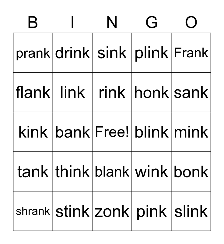 This bingo card has a free space and 24 words: think, stink, rink, shrank, Frank, prank, flank, drink, blink, blank, honk, kink, wink, bonk, link, pink, mink, sink, sank, bank, slink, tank, plink and zonk.
