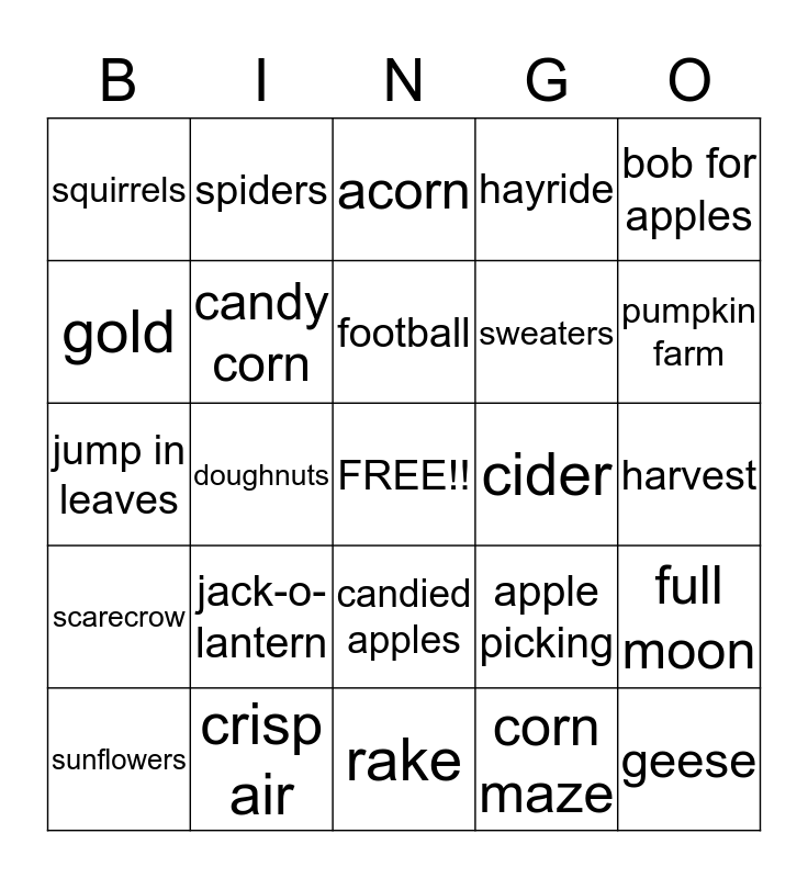 This bingo card has a free space and 30 words: crisp air, falling leaves, doughnuts, cornucopia, squirrels, acorn, candy corn, candied apples, cider, rake, harvest, geese, corn maze, orange, pumpkin farm, bonfire, apple picking, scarecrow, jack-o-lantern, bob for apples, jump in leaves, costumes, spiders, sweaters, gold, hayride, full moon, sunflowers, football and autumn.