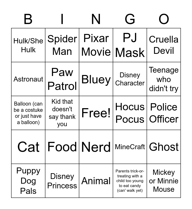 This bingo card has a free space and 86 words: Doctor, Nurse, Nerd, Grogu (AKA baby yoda), Buzz Lightyear, Harry Potter Theme, TV Character, Witch, Pumpkin, Super Hero, Clown, Political, Ghost, Police Officer, Alice in Wonderland Character, 90's Movie Character, Bluey, Dinosaur, Cowboy, Inflatable, Star Wars, Bug, Angel, Balloon (can be a costuke or just have a balloon), Historical, Parents trick-or-treating with a child too young to eat candy (can' walk yet), Family Costume, Dog dressed in a costume, Fire Fighter, Devil, Mermaid, Disney Princess, Marvel Superhero, Unicorn, Food, Astronaut, PokΓ©mon, Teenage who didn't try, family with wagon, Pillowcase to collect candy, Kid that doesn't say thank you, Based off a movie, Alien, Adams Family Character, Hocus Pocus, Criminal, Cruella Devil, Among Us Character, Spider Man, Thor, Dr. Strange, Minion, Vampire, Cat, Pirate, Knight, Dragon, Skeleton, Disney Character, PJ Mask, Paw Patrol, Hulk/She Hulk, Black Panther, Fairy, Video Game Character, Ninja, Pixar Movie, Hippie, Mickey or Minnie Mouse, Robot, Ballerina, Fake Blood, Spider, Puppy Dog Pals, Sports Team/Athlete, Couple Costume, Scary Costume, Animal, Costume with a mask, Pilot, Hocus Pocus, Elvis, Wednesday Adams, Encanto, Zombie, MineCraft and Babyshark.