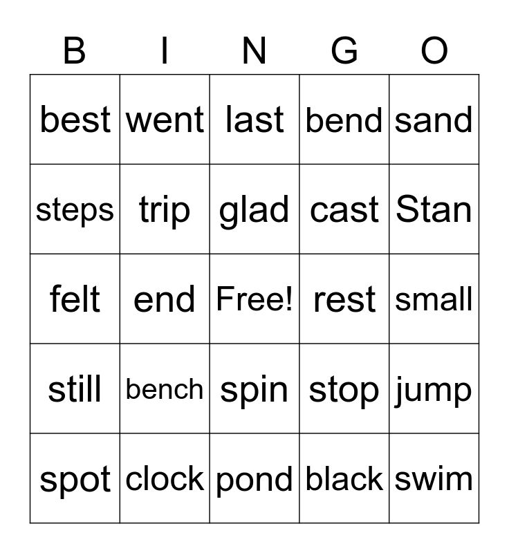 This bingo card has a free space and 25 words: bench, pond, glad, spot, sand, best, steps, went, rest, spin, cast, felt, stop, jump, trip, hand, small, last, Stan, end, swim, clock, still, bend and black.
