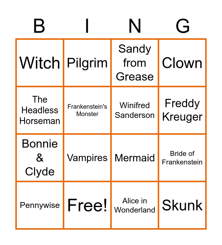 This bingo card has 21 words: Free!, Creepy Doll, Pilgrim, A Bunch of Grapes, Alice in Wonderland, Winifred Sanderson, Witch, Sandy from Grease, Mermaid, Freddy Kreuger, Bonnie & Clyde, Clown, Skunk, Dracula, Frankenstein's Monster, Zombies, Pennywise, Vampires, The Headless Horseman, Bride of Frankenstein and Werewolf.