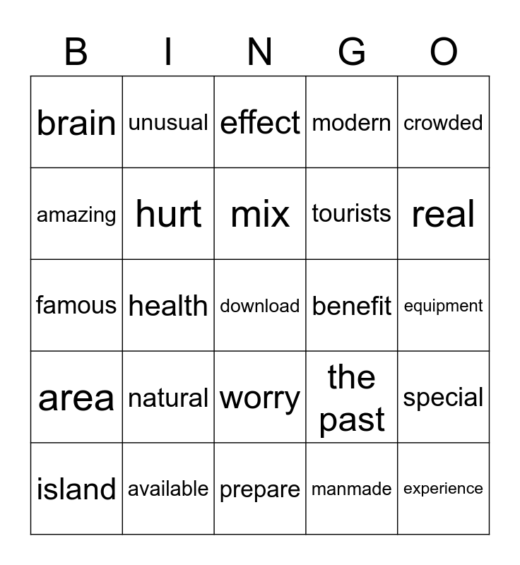 This bingo card has 30 words: available, depend on, health, rest, brain, effect, hurt, worry, benefit, prepare, equipment, download, manmade, experience, real, hard, the past, area, natural, crowded, famous, quiet, unusual, tourists, amazing, modern, special, island, mix and view.
