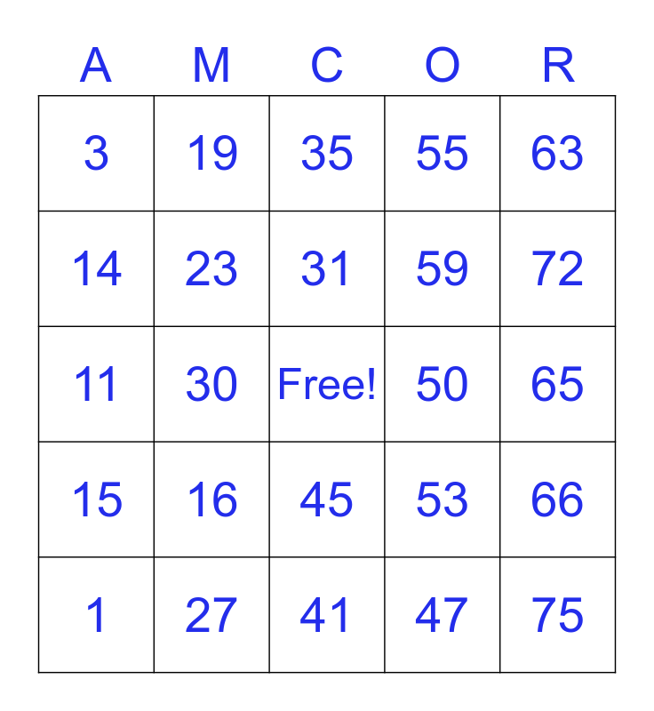 This bingo card has a free space and 24 words: 1, 16, 31, 47, 63, 3, 19, 35, 50, 65, 11, 23, 53, 66, 14, 27, 41, 55, 72, 15, 30, 45, 59 and 75.