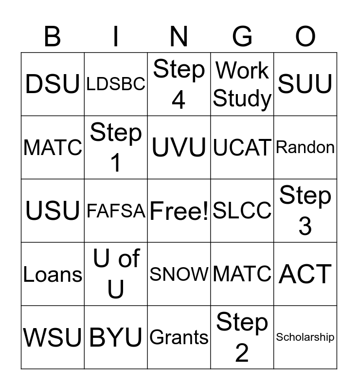 This bingo card has a free space and 24 words: U of U, BYU, UVU, WSU, SUU, DSU, MATC, LDSBC, SLCC, SNOW, UCAT, USU, MATC, ACT, Step 1, Step 2, Step 3, Step 4, Randon, FAFSA, Scholarship, Loans, Work Study and Grants.