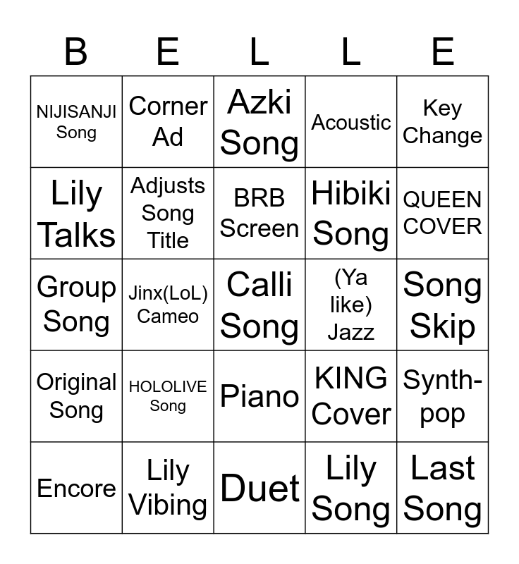 This bingo card has a free space and 24 words: HOLOLIVE Song, Lily Vibing, BRB Screen, Encore, Key Change, NIJISANJI Song, Lily Talks, Corner Ad, (Ya like) Jazz, Piano, Hibiki Song, Group Song, KING Cover, Synth-pop, Adjusts Song Title, Lily Song, Song Skip, Azki Song, QUEEN COVER, Jinx(LoL) Cameo, Last Song, Original Song, Acoustic and Duet.
