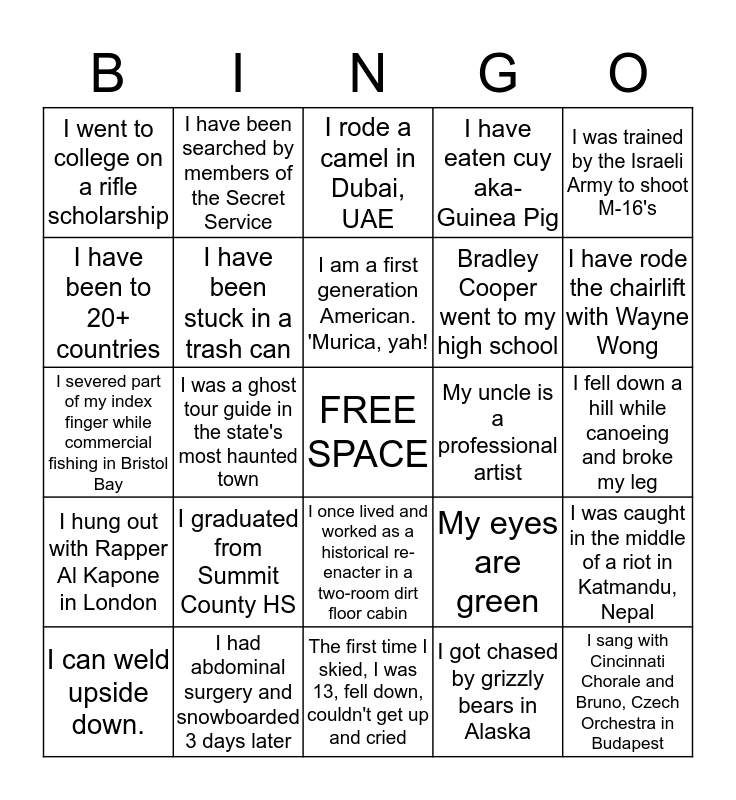 This bingo card has a free space and 24 words: I graduated from Summit County HS, I had abdominal surgery and snowboarded 3 days later, I am a first generation American. 'Murica, yah!, I can weld upside down., I was trained by the Israeli Army to shoot M-16's, I went to college on a rifle scholarship, I have been to 20+ countries, I have been searched by members of the Secret Service, My uncle is a professional artist, I once lived and worked as a historical re-enacter in a two-room dirt floor cabin, Bradley Cooper went to my high school, I severed part of my index finger while commercial fishing in Bristol Bay, My eyes are green, I was caught in the middle of a riot in Katmandu, Nepal, I have been stuck in a trash can, I got chased by grizzly bears in Alaska, I fell down a hill while canoeing and broke my leg, I rode a camel in Dubai, UAE, I have rode the chairlift with Wayne Wong, I was a ghost tour guide in the state's most haunted town, I sang with Cincinnati Chorale and Bruno, Czech Orchestra in Budapest, I hung out with Rapper Al Kapone in London, I have eaten cuy aka- Guinea Pig and The first time I skied, I was 13, fell down, couldn't get up and cried.