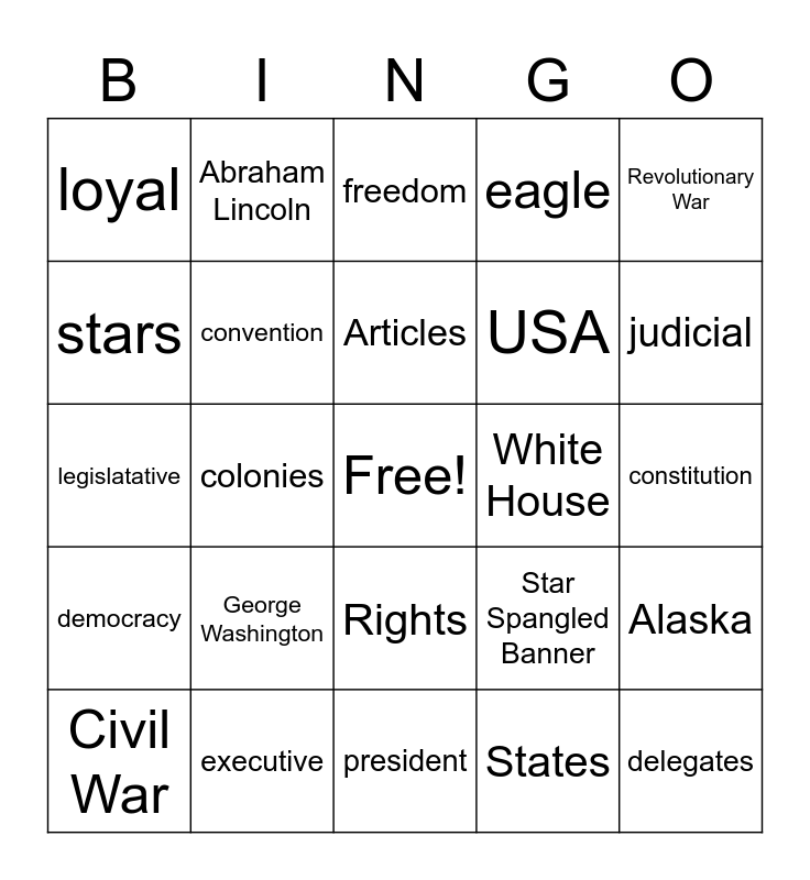 This bingo card has a free space and 34 words: Montana, States, James Madison, posterity, democracy, convention, Revolutionary War, Civil War, Abraham Lincoln, Preamble, Articles, freedom, amendments, Washington Memorial, White House, judicial, executive, legislatative, George Washington, Star Spangled Banner, Rights, Red, white and blue, loyal, constitution, president, delegates, eagle, Statue of Liberty, USA, stars, stripes, colonies, Alaska and Liberty Bell.