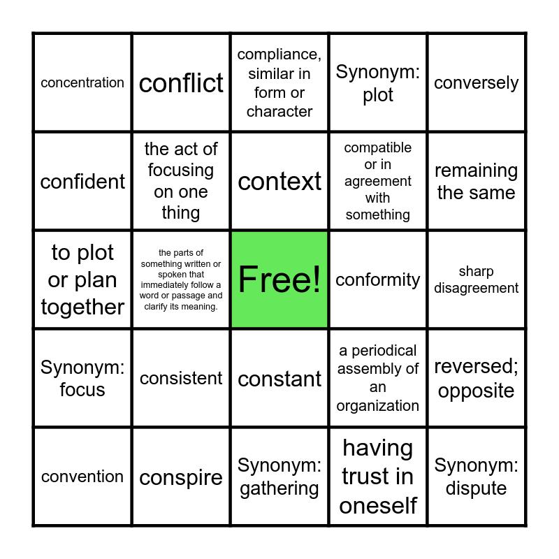 This bingo card has a free space and 24 words: consistent, conspire, context, convention, conversely, concentration, confident, conflict, conformity, constant, compatible or in agreement with something, to plot or plan together, a periodical assembly of an organization, reversed; opposite, the act of focusing on one thing, having trust in oneself, sharp disagreement, compliance, similar in form or character, remaining the same, the parts of something written or spoken that immediately follow a word or passage and clarify its meaning., Synonym: dispute, Synonym: focus, Synonym: plot and Synonym: gathering.