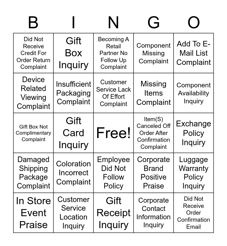 This bingo card has a free space and 105 words: Account Deletion Request (Non California Residents), Add Promotional Code To Existing Order Inquiry, Add To E-Mail List Complaint, Add To Existing Order Inquiry, Add To Text Message List Complaint, Add To USPS Mailing List Request, Adjustable Strap Complaint, Alleged Instore Injury Complaint, Alleged Personal Injury Complaint, Alleged Property Damage Complaint, Alleged Racism / Discrimination Complaint, Ambassador Program Inquiry, Available Color or Pattern Inquiry, Available Color Selection Complaint, Available Style Inquiry, Become A Retail Partner Process Inquiry, Becoming A Retail Partner No Follow Up Complaint, Cancel Entire Order Inquiry, Care / Wash Instructions Inquiry, Catalog Request Inquiry, Charged Incorrectly For Items Complaint, Charged Incorrectly For Shipping Complaint, Closure (Magnet, Toggle, Zipper) Complaint, Color Bleeding During Wash Complaint, Color Bleeding When Wet Complaint, Coloration Incorrect Complaint, Component Availability Inquiry, Component Missing Complaint, Container Cracked/Broken Complaint, Copy Of Receipt Or Invoice Inquiry, Corporate Brand Positive Praise, Corporate Contact Information Inquiry, Corporate Customer Service Praise, Corporate Employment Inquiry, Correct Existing Order Inquiry, Couldn't Add Items To Shopping Cart Complaint, Cracking Or Peeling Complaint, Customer Service Incorrect Information Complaint, Customer Service Lack Of Effort Complaint, Customer Service Location Inquiry, Customer Service Rude Service Complaint, Damaged Shipping Package Complaint, Delivery Service Level Not Met Complaint, Device Related Viewing Complaint, Did Not Place Order - Charge Card Fraud Complaint, Did Not Receive Credit For Order Return Complaint, Did Not Receive Electronic Gift Card Number (Egc), Did Not Receive Order Confirmation Email, Did Not Receive Promised Resolution Complaint (Egc, Nco Etc), Did Not Receive Shipping Confirmation Email, Did Not Receive Specific Offer Complaint, Difficulty Placing Order Via Website Mobile Complaint, Dimension Confusion Complaint, Discontinued Color Complaint, Discontinued Style Complaint, Donation Request Inquiry, Duplicate Contact Non Legitimate (Must Add Note), Duplicate Order Complaint, Electronic Gift Certificate Redemption Inquiry, Employee Did Not Follow Policy, Exchange Policy Inquiry, Floor Employee Rude Service Complaint, Form Of Payment Declined Complaint, Foundation Event Information Inquiry, Free Product Request General Inquiry, Frequency Of Offer Complaint - Too Few Complaint, General Construction Decline In Quality Complaint, Gift Box Inquiry, Gift Box Not Complimentary Complaint, Gift Card Inquiry, Gift Receipt Inquiry, Glue Residue Complaint, Guest Donation To Foundation Inquiry, Hours Of Operation Complaint, Hours Of Operation Inquiry, Id Window Defective, In Store Event Complaint, In Store Event Inquiry, In Store Event Praise, Incorrect Payment Method On Existing Order Inquiry, Incorrect Shipping Method Complaint, Incorrect Size Received, In-Store Pickup Inquiry, Insufficient Packaging Complaint, Item Arrived Broken Complaint, Item(S) Canceled Off Order After Confirmation Complaint, Lack Of Repair Service Complaint, Lock Broken Complaint - Hard Side Luggage, Lock Function/Instruction Complaint, Long Wait Time Cs Complaint, Lost Package Complaint, Lost Promotional Code Complaint, Luggage Lock-Reset Complaint, Luggage Registration Inquiry, Luggage Warranty Policy Inquiry, Material Fading Complaint, Missed Or Expired Promotion Complaint, Missed Or Expired Promotion Redemption Inquiry, Missing Items Complaint, Multiple Credit Card Charges Complaint, Multiple Credit Card Charges Inquiry, Multiple Shipments Complaint, Multiple Shipping Fee Complaint, Name Plate Placement Incorrect Complaint and New Product Inquiry (Products That Vb Doesn't Produce).