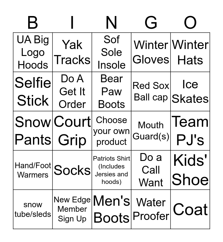 This bingo card has a free space and 24 words: Socks, New Edge Member Sign Up, Bear Paw Boots, snow tube/sleds, Winter Hats, UA Big Logo Hoods, Selfie Stick, Yak Tracks, Mouth Guard(s), Patriots Shirt (Includes Jersies and hoods), Red Sox Ball cap, Snow Pants, Do a Call Want, Kids' Shoe, Do A Get It Order, Water Proofer, Team PJ's, Sof Sole Insole, Ice Skates, Court Grip, Coat, Hand/Foot Warmers, Winter Gloves and Men's Boots.