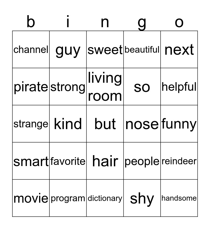This bingo card has a free space and 24 words: favorite, program, living room, movie, next, channel, pirate, guy, nose, hair, so, strange, people, reindeer, strong, shy, funny, sweet, helpful, kind, handsome, smart, beautiful and dictionary.