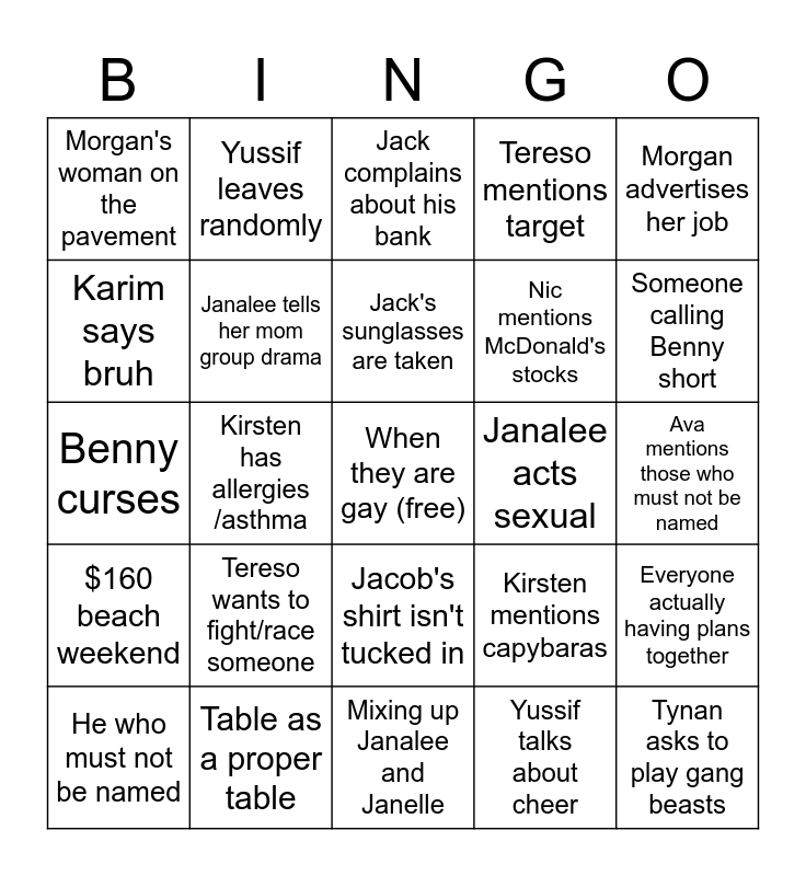 This bingo card has a free space and 24 words: Tereso wants to fight/race someone, Table as a proper table, Jack's sunglasses are taken, He who must not be named, Morgan advertises her job, Morgan's woman on the pavement, Karim says bruh, Yussif leaves randomly, Janalee acts sexual, Jacob's shirt isn't tucked in, Nic mentions McDonald's stocks, Benny curses, Kirsten mentions capybaras, Everyone actually having plans together, Janalee tells her mom group drama, Yussif talks about cheer, Ava mentions those who must not be named, Jack complains about his bank, Someone calling Benny short, Kirsten has allergies /asthma, Tynan asks to play gang beasts, $160 beach weekend, Tereso mentions target and Mixing up Janalee and Janelle.