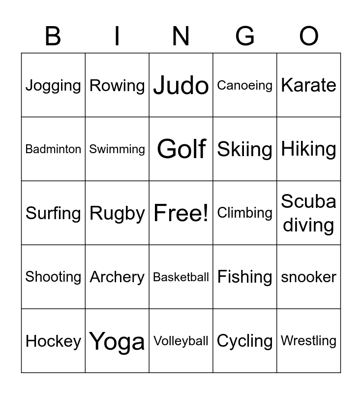 This bingo card has a free space and 24 words: Archery, Yoga, Golf, Hockey, Karate, Jogging, Badminton, Rowing, Climbing, Basketball, Skiing, Surfing, Fishing, snooker, Swimming, Cycling, Scuba diving, Judo, Hiking, Rugby, Wrestling, Shooting, Canoeing and Volleyball.