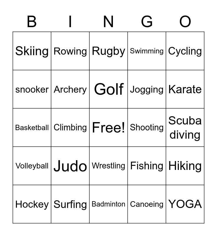 This bingo card has a free space and 24 words: Judo, Surfing, Golf, Hockey, Cycling, Skiing, snooker, Rowing, Shooting, Wrestling, Jogging, Basketball, Fishing, Hiking, Archery, Canoeing, Scuba diving, Rugby, Karate, Climbing, YOGA, Volleyball, Swimming and Badminton.