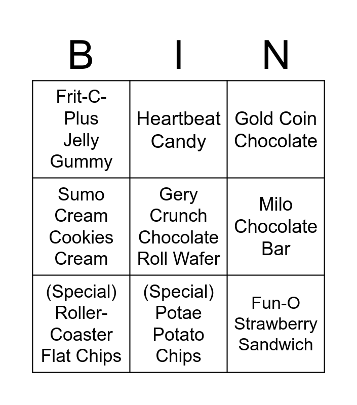 This bingo card has a free space and 8 words: Milo Chocolate Bar, Gold Coin Chocolate, Heartbeat Candy, (Special) Roller-Coaster Flat Chips, Frit-C-Plus Jelly Gummy, Fun-O Strawberry Sandwich, Sumo Cream Cookies Cream and (Special) Potae Potato Chips.