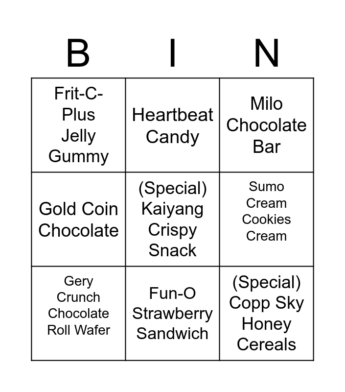 This bingo card has a free space and 8 words: Sumo Cream Cookies Cream, Milo Chocolate Bar, Heartbeat Candy, Gery Crunch Chocolate Roll Wafer, Frit-C-Plus Jelly Gummy, (Special) Copp Sky Honey Cereals, Gold Coin Chocolate and Fun-O Strawberry Sandwich.