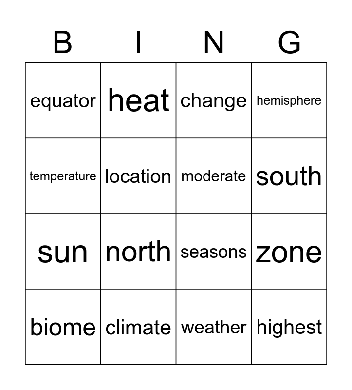 This bingo card has 16 words: climate, zone, change, equator, sun, heat, seasons, weather, temperature, location, biome, hemisphere, north, south, moderate and highest.
