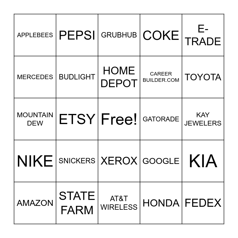 This bingo card has a free space and 55 words: ALLSTATE, AMAZON, APPLE, APPLEBEES, AT&T WIRELESS, BMW, BUDLIGHT, BUDWEISER, CAREER BUILDER.COM, CHEETOS, COKE, COOR LIGHT, CORONA, COVID, DISNEY, DORITOS, E-TRADE, ETSY, FARMER'S INSURANCE, FEDEX, GATORADE, GEICO, GOOGLE, GRUBHUB, HEINEKEN, HOME DEPOT, HONDA, INDEED, KAY JEWELERS, KIA, LIBERTY MUTUAL, M&Ms, MASTERCARD, McDONALDS, MERCEDES, MOUNTAIN DEW, NFL, NIKE, OLD SPICE, PELOTON, PEPSI, PERSCRIPTION DRUG, PETS.COM, SMANSUNG, SNICKERS, STATE FARM, SPRINT, TARGET, T-MOBILE, TOYOTA, UPS, VERIZON, VW, XEROX and ZIP RECRUITER.