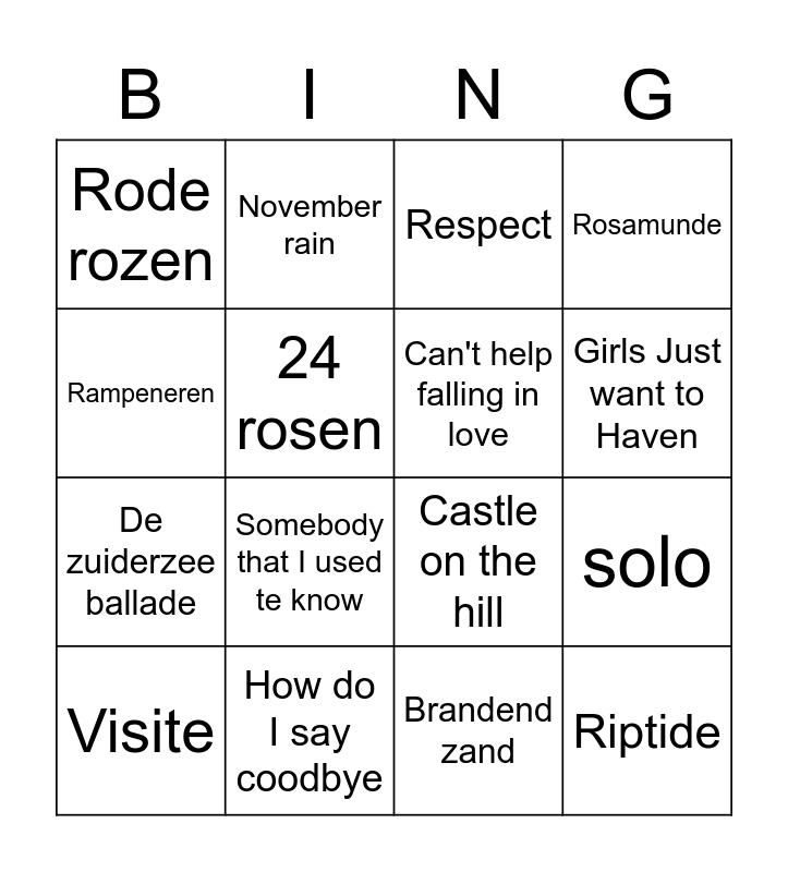 This bingo card has 33 words: Free!, Kernkraft 400, solo, This one's fot ypu, Riptide, Can't help falling in love, Rampeneren, Party in the USA, November rain, Sorry, Girls Just want to Haven, Respect, Jump, Let it Be, How do I say coodbye, Somebody that I used te know, Summer of 69, Castle on the hill, Hup holland hup, De cowboydans, Bad habits, Can's stop the feeling, Rode rozen, Brandend zand, Bim bam, Visite, Rosamunde, De zuiderzee ballade, 24 rosen, Het dorp, De glimlacht van een kind, Rio and Brabant.