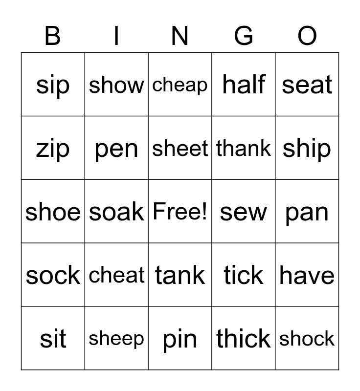 This bingo card has a free space and 24 words: cheat, sheep, sheet, sit, seat, sip, zip, show, sew, tank, thank, shoe, tick, have, pen, thick, pan, cheap, ship, soak, shock, sock, half and pin.