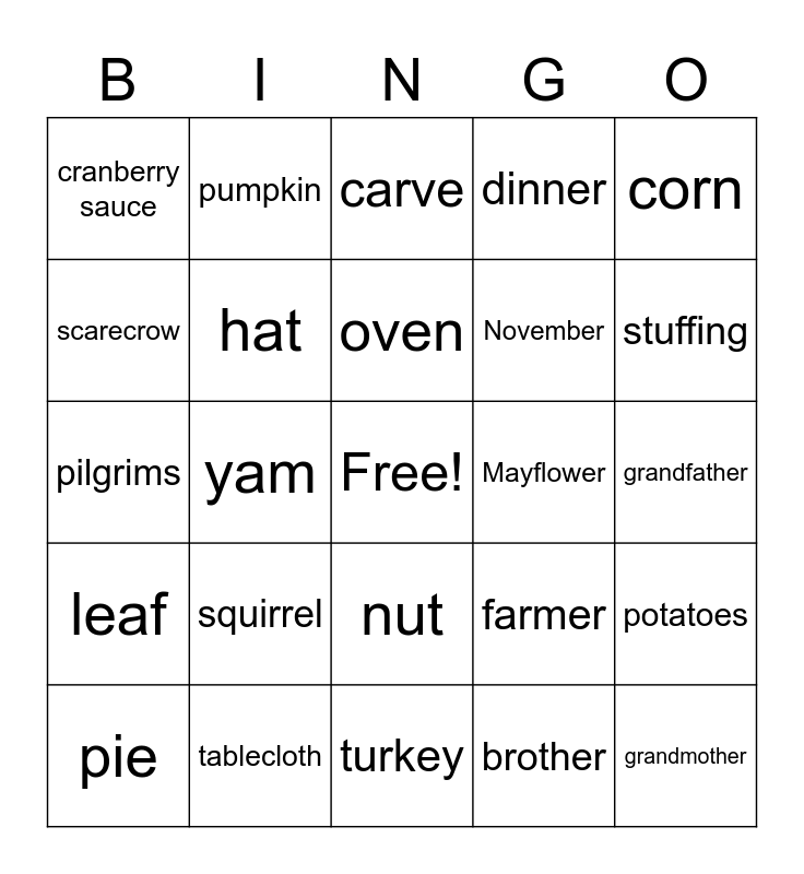 This bingo card has a free space and 27 words: farmer, plate, November, turkey, scarecrow, carve, pumpkin, leaf, Mayflower, potatoes, pilgrims, dinner, pie, tablecloth, stuffing, table, hat, oven, squirrel, cranberry sauce, grandfather, brother, yam, grandmother, nut, corn and football.