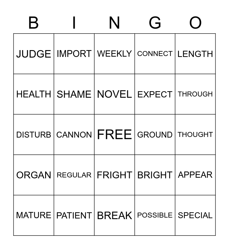 This bingo card has a free space and 24 words: REGULAR, PATIENT, NOVEL, MATURE, LENGTH, JUDGE, HEALTH, IMPORT, GROUND, FRIGHT, EXPECT, DISTURB, BRIGHT, APPEAR, SHAME, POSSIBLE, THOUGHT, WEEKLY, THROUGH, CANNON, SPECIAL, ORGAN, CONNECT and BREAK.