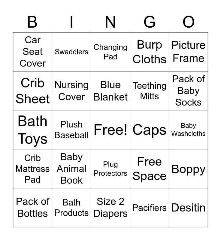 This bingo card has a free space and 25 words: Baby Animal Book, Size 2 Diapers, Blue Blanket, Pack of Bottles, Picture Frame, Car Seat Cover, Crib Sheet, Swaddlers, Caps, Plug Protectors, Teething Mitts, Bath Toys, Free Space, Boppy, Nursing Cover, Nail Clippers, Baby Washcloths, Changing Pad, Pack of Baby Socks, Plush Baseball, Desitin, Bath Products, Crib Mattress Pad, Burp Cloths and Pacifiers.