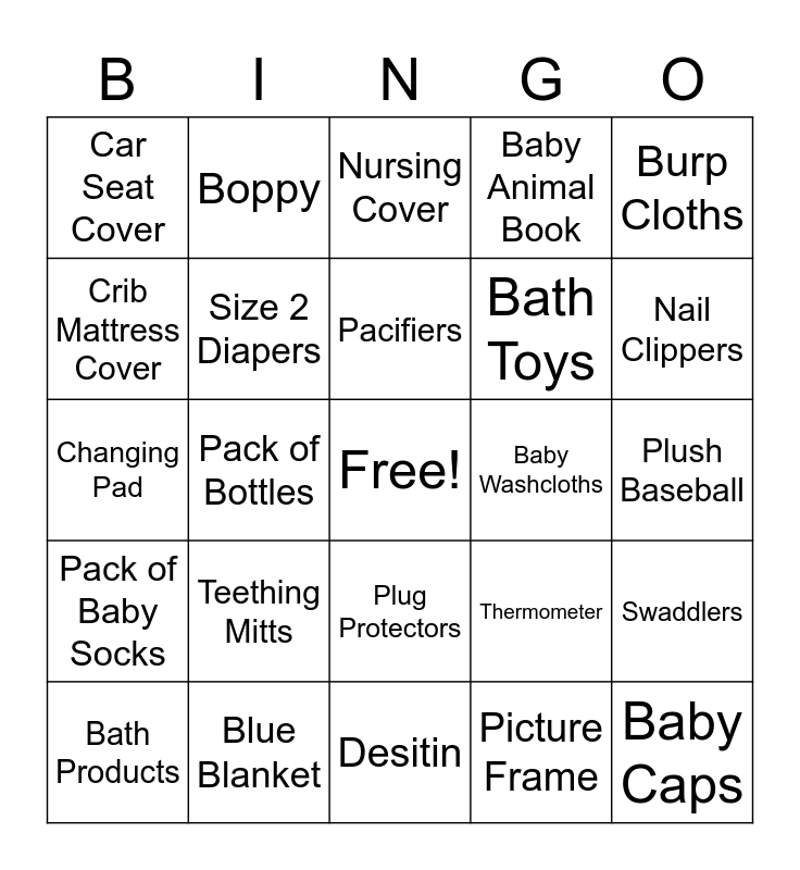 This bingo card has a free space and 25 words: Teething Mitts, Desitin, Pacifiers, Bath Products, Burp Cloths, Car Seat Cover, Crib Mattress Cover, Boppy, Baby Washcloths, Plug Protectors, Bath Toys, Changing Pad, Thermometer, Swaddlers, Size 2 Diapers, Crib Sheet, Plush Baseball, Nursing Cover, Nail Clippers, Pack of Bottles, Baby Caps, Blue Blanket, Pack of Baby Socks, Baby Animal Book and Picture Frame.