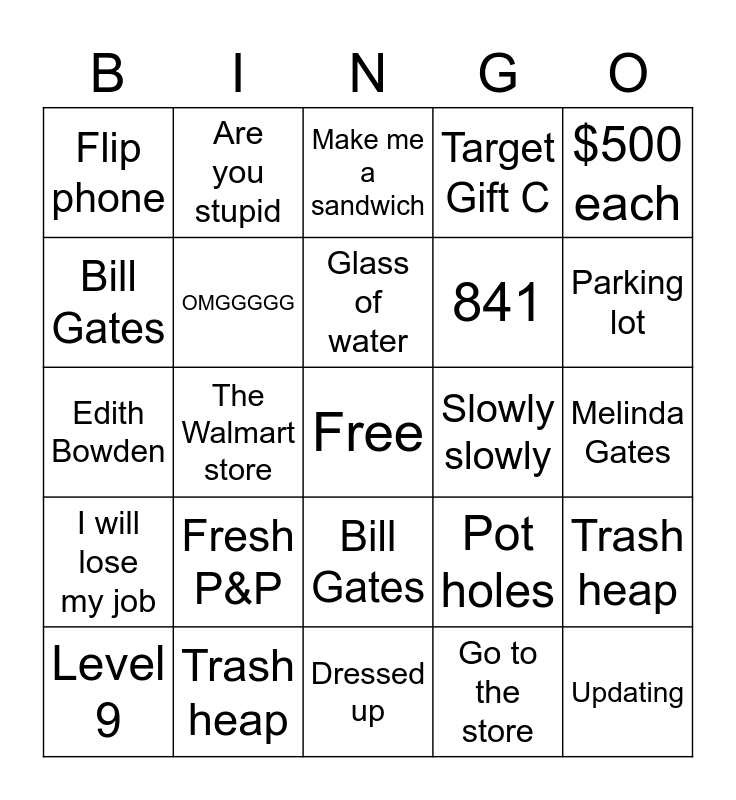 This bingo card has a free space and 49 words: Ma’am, Updating, D1T, Dressed up, Fresh P&P, Whaat, Are you stupid, 4 the love of Pete, Bill Gates, Mudda chode, OMGGGGG, Target Gift C, Trash heap, Pot holes, I will send the police, Use the bath room, Glass of water, Slowly slowly, Subway, $500 each, The Walmart store, Go to the store, Flip phone, 841, Steve Watson, Parking lot, Level 9, 2nd floor, Bill Gates, I will lose my job, I can’t see my screen, Excuse me, Don’t answer his calls, Go to the store, Trash heap, Updating, Glass of water, Flip phone, Melinda Gates, Slowly slowly, Did you get the cards, Are you stupid, How far to store, I will send the police, Edith Bowden, Make me a sandwich, Long line, Microsoft and You sound much younger.