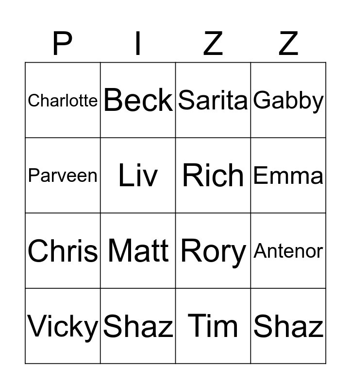 This bingo card has a free space and 18 words: Matt, Lucy, Sarita, Charlotte, Shaz, Gabby, Vicky, Beck, Emma, Chris, Tim, Parveen, Antenor, Liv, Rich, Cece, Shaz and Laura.