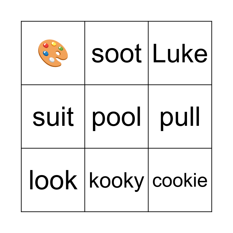 This bingo card has 9 words: look, Luke, soot, suit, 🎨, pull, pool, cookie and kooky.