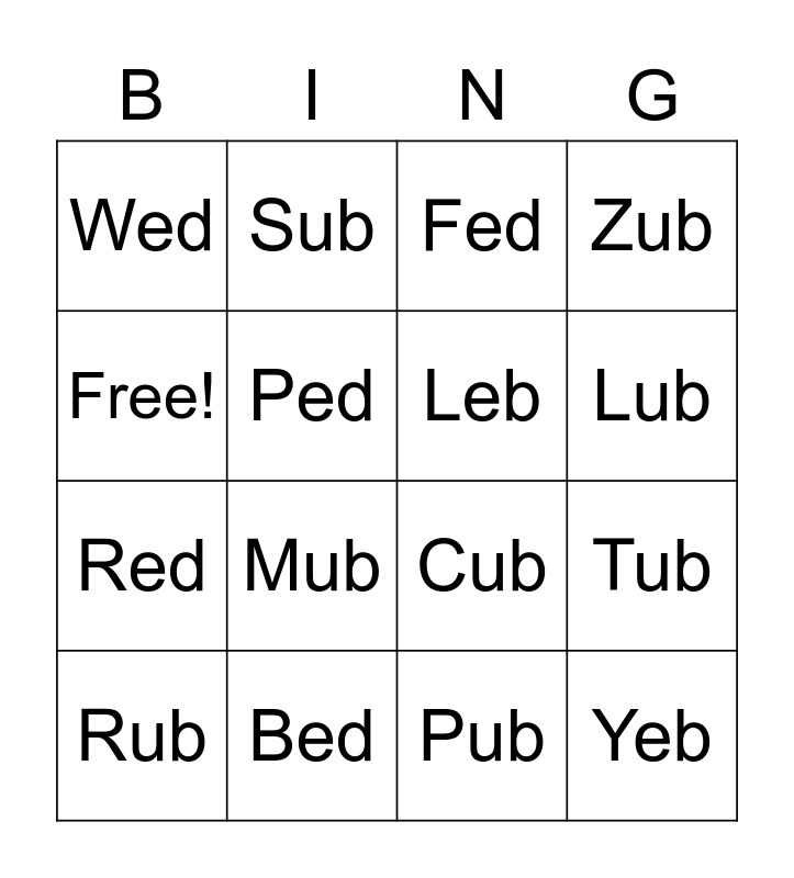 This bingo card has 16 words: Bed, Tub, Fed, Wed, Red, Sub, Cub, Pub, Free!, Ped, Rub, Zub, Mub, Lub, Leb and Yeb.