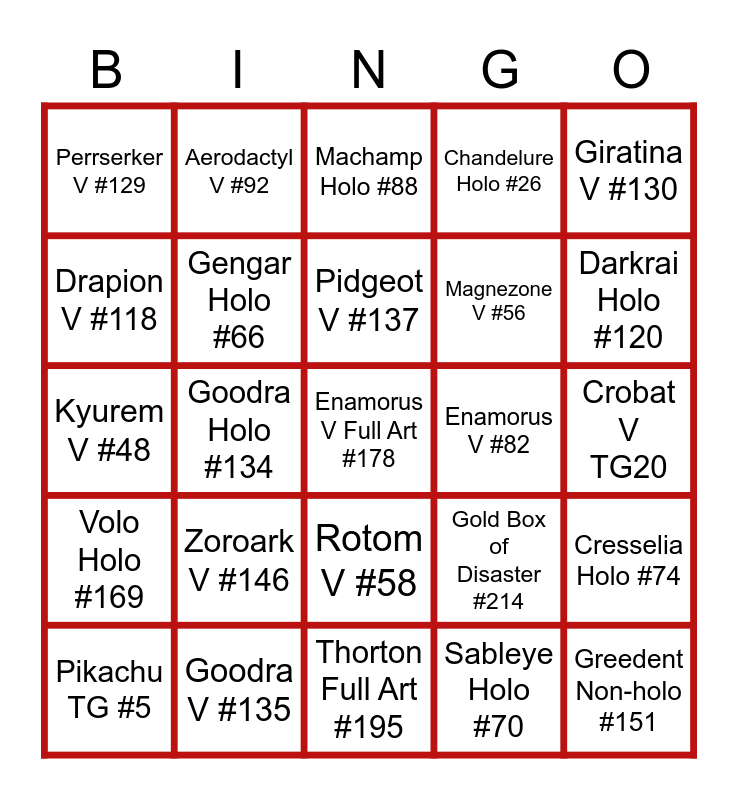 This bingo card has a free space and 24 words: Zoroark V #146, Goodra V #135, Pidgeot V #137, Pikachu TG #5, Giratina V #130, Perrserker V #129, Drapion V #118, Aerodactyl V #92, Enamorus V #82, Rotom V #58, Magnezone V #56, Kyurem V #48, Gold Box of Disaster #214, Cresselia Holo #74, Gengar Holo #66, Sableye Holo #70, Crobat V TG20, Machamp Holo #88, Darkrai Holo #120, Goodra Holo #134, Greedent Non-holo #151, Volo Holo #169, Chandelure Holo #26 and Thorton Full Art #195.