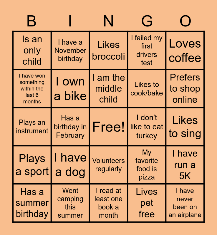 This bingo card has a free space and 48 words: I've created an assignment that all students in a class have completed, I have never been on an airplane, I was not born in MD, I read at least one book a month, I have a dog, I have a cat, I have a November birthday, I own a boat, I have won something within the last 6 months, I have never broken a bone, I own a bike, I failed my first drivers test, I have run a 5K, My favorite food is pizza, I am the youngest child, I am the oldest child, I am the middle child, I don't like to eat turkey, Favorite vacation spot is at the beach, Loves coffee, Has a birthday in February, Lives pet free, Is an only child, Likes to cook/bake, Teaching is your second career, Prefers to shop online, Has a summer birthday, Has lived somewhere other than Maryland, Volunteers regularly, Plays a sport, Took summer classes, Enjoys swimming, Wears glasses, Ate candy today, Went camping this summer, Likes to draw, Can't dance, Likes to sing, Favorite color is green, Knows how to ski, Favorite ice cream is chocolate, Has been to Disney World, Likes broccoli, Attended a concert within the last 6 months, Plays an instrument, Doesn't drink coffee, Went to school outside of MD and Is caught up on grading.
