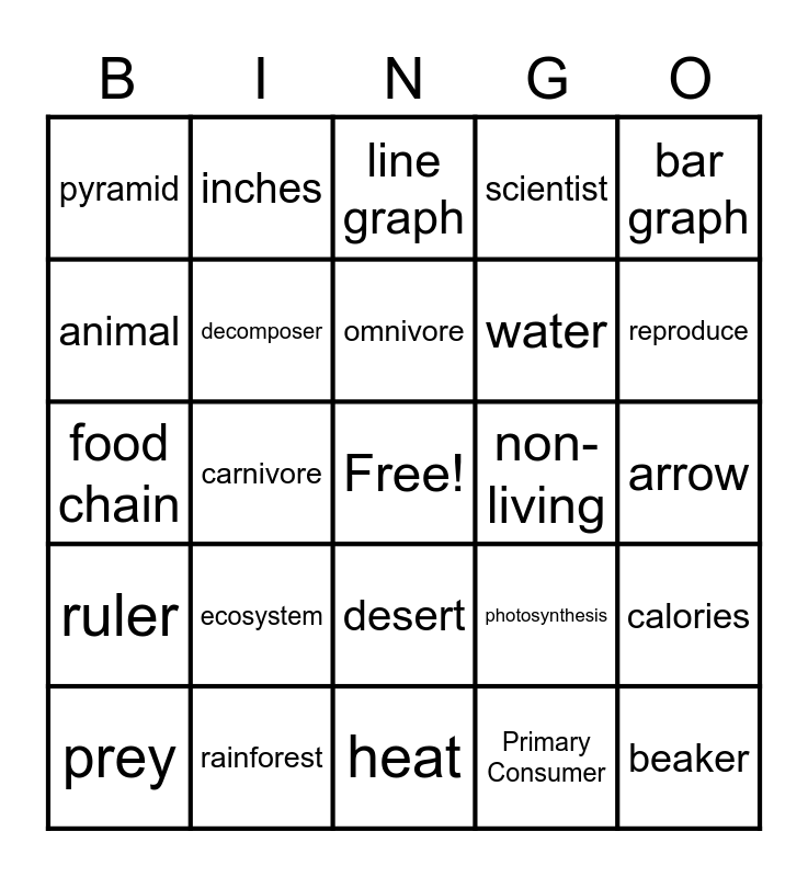 This bingo card has a free space and 32 words: Primary Consumer, herbivore, carnivore, energy, ruler, decomposer, bar graph, calories, inches, secondary consumer, omnivore, line graph, microscope, food web, non-living, predator, prey, food chain, desert, ecosystem, photosynthesis, bacteria, arrow, rainforest, beaker, scientist, water, animal, pyramid, heat, grow and reproduce.