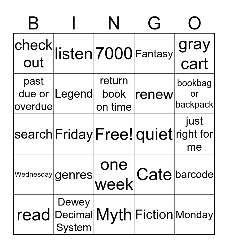 This bingo card has a free space and 24 words: genres, Dewey Decimal System, return book on time, read, gray cart, check out, past due or overdue, listen, quiet, one week, renew, search, Cate, barcode, Legend, Fiction, just right for me, 7000, bookbag or backpack, Friday, Monday, Wednesday, Fantasy and Myth.