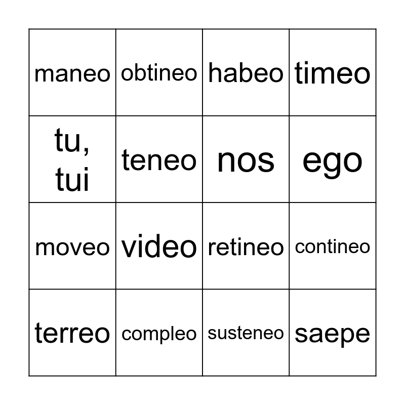 This bingo card has 16 words: compleo, contineo, habeo, maneo, moveo, obtineo, retineo, susteneo, tu, tui, teneo, terreo, timeo, video, ego, nos and saepe.