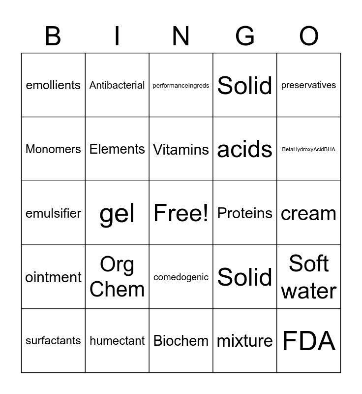 This bingo card has a free space and 49 words: Chemistry, FDA, Periodic Law, Biochem, Org Chem, Ionic Bond, Antibacterial, Compound, Monomers, Molecule, Elements, Solid, Soft water, Solid, Oxygen, Hypoallergenic, Vitamins, Proteins, Antioxidants, preservatives, gel, mixture, emollients, acids, emulsion, BetaHydroxyAcidBHA, surfactants, PolyHydroxAcid, comedogenic, ointment, chelatingAgent, Viscosity/Thickner, solvent, aerosol, humectant, fattyacids, pH, powders, cream, botanicals, essentialOils, enzymes, retinoid/retinol, brightener, emulsifier, performanceIngreds, functionalIngreds, amino acids and covalent bond.
