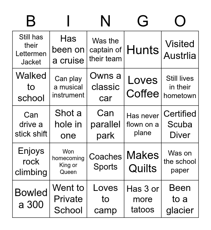This bingo card has a free space and 24 words: Won homecoming King or Queen, Went to Private School, Owns a classic car, Bowled a 300, Visited Austrlia, Still has their Lettermen Jacket, Walked to school, Has been on a cruise, Has never flown on a plane, Coaches Sports, Loves Coffee, Can drive a stick shift, Makes Quilts, Was on the school paper, Can play a musical instrument, Has 3 or more tatoos, Certified Scuba Diver, Was the captain of their team, Still lives in their hometown, Shot a hole in one, Been to a glacier, Enjoys rock climbing, Hunts and Loves to camp.