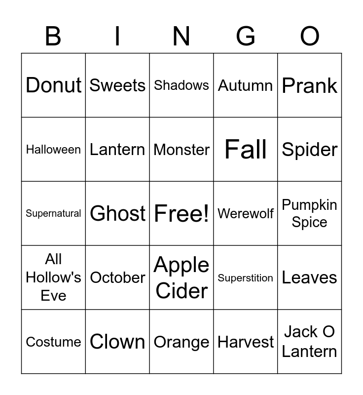 This bingo card has a free space and 33 words: Pumpkin, Witch, Ghost, Trick or Treat, All Hollow's Eve, Lantern, Prank, Costume, Sweets, Darkness, Monster, Shadows, Decorations, Moonlight, Werewolf, Spider, Clown, Supernatural, October, Superstition, Apple Cider, Apple Picking, Donut, Pumpkin Spice, Orange, Jack O Lantern, Autumn, Fall, Halloween, Leaves, Hayride, Harvest and Scarecrow.