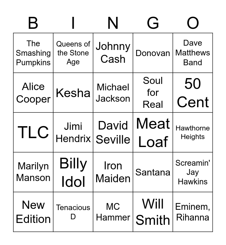 This bingo card has 49 words: The Cramps, David Seville, Retrospectre, MC Hammer, Billy Idol, Korn, Queens of the Stone Age, The Killers, Alice Cooper, MGMT, Kesha, Donovan, Screamin' Jay Hawkins, Santana, Christina Aguilera, AC/DC, Michael Jackson, Meat Loaf, Whodini, Dave Matthews Band, Jimi Hendrix, Will Smith, The Smashing Pumpkins, Soul for Real, Marcy Playground, 50 Cent, New Edition, Pink Floyd, Iron Maiden, Marilyn Manson, Run DMC, The Rolling Stones, Eagles, Van Halen, Tenacious D, Metallica, Rob Zombie, Coldplay, Hawthorne Heights, Lady Gaga, KISS, Dead Kennedys, Eminem, Rihanna, Wolfmother, TLC, Johnny Cash, Van Morrison, Foreigner and Taylor Swift.
