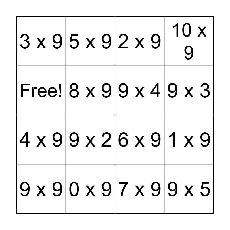 This bingo card has 16 words: 0 x 9, 1 x 9, 2 x 9, 3 x 9, 4 x 9, 5 x 9, 6 x 9, 7 x 9, Free!, 8 x 9, 9 x 9, 10 x 9, 9 x 2, 9 x 3, 9 x 4 and 9 x 5.
