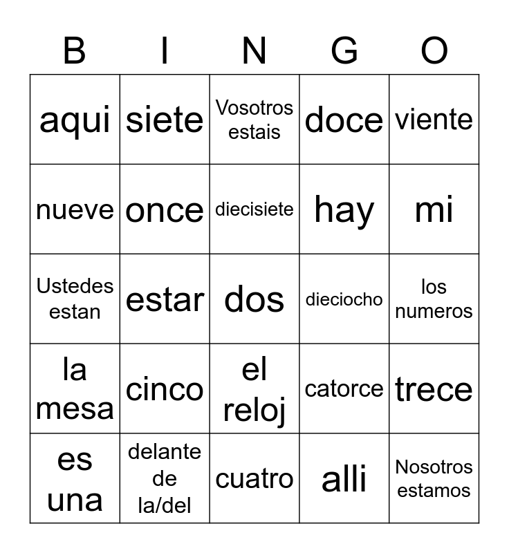 This bingo card has 46 words: uno, dos, tres, cuatro, cinco, seis, siete, ocho, nueve, diez, once, doce, trece, catorce, quince, dieciseis, diecisiete, dieciocho, diecinueve, viente, estar, alli, aqui, hay, tu, mi, es una, unos,unas, el reloj, la mesa, la puerta, la ventana, la mochila, de, detras de la/del, delante de la/del, los numeros, Yo estoy, Tu estas, El, ella, usted esta, Nosotros estamos, Vosotros estais, Ustedes estan, cero, en and la cartel.