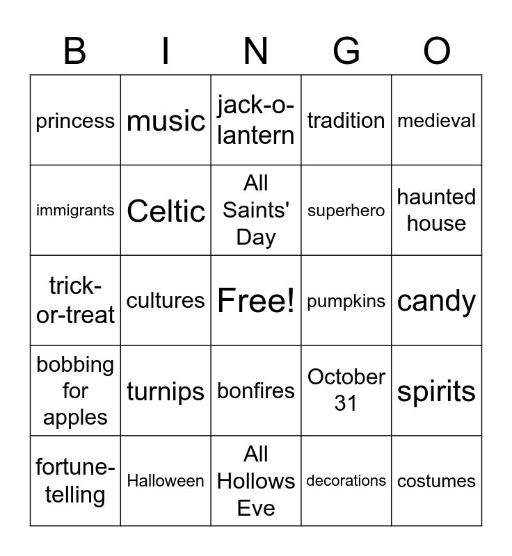 This bingo card has a free space and 30 words: Halloween, Samhain, cultures, monster, princess, jack-o-lantern, Celtic, bonfires, pumpkins, All Hollows Eve, candy, costumes, decorations, ghost, haunted house, pranks, October 31, bobbing for apples, turnips, medieval, trick-or-treat, party, music, superhero, immigrants, tradition, spirits, fortune-telling, All Saints' Day and mumming.